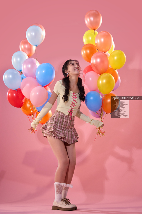 图片标题: 一位充满活力的年轻女孩拿着大量气球