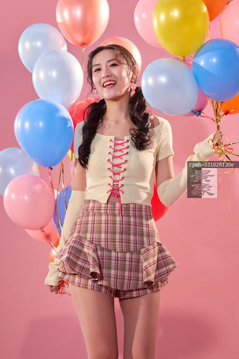 图片标题: 一位充满活力的年轻女孩拿着大量气球