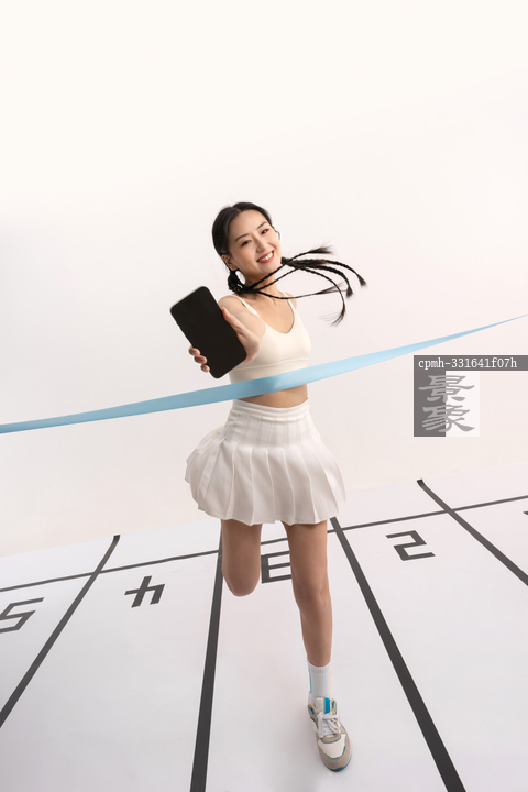 图片标题: 一位青年女人拿着手机奔跑冲刺