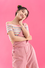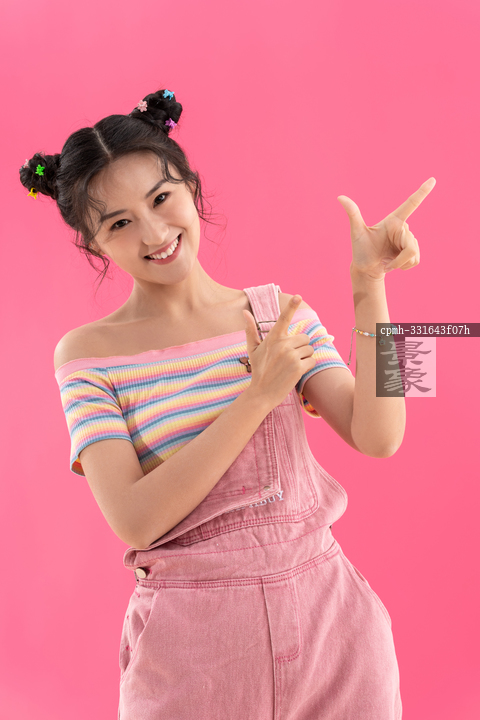 图片标题:     粉色背景下穿背带裤的快乐女孩