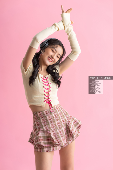 图片标题:     粉色背景下听音乐跳舞的快乐女孩