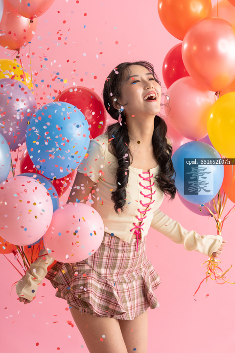 图片标题: 一位充满活力的年轻女孩拿着大量气球