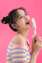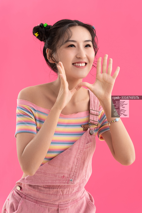 图片标题: 粉色背景下穿背带裤的快乐女孩