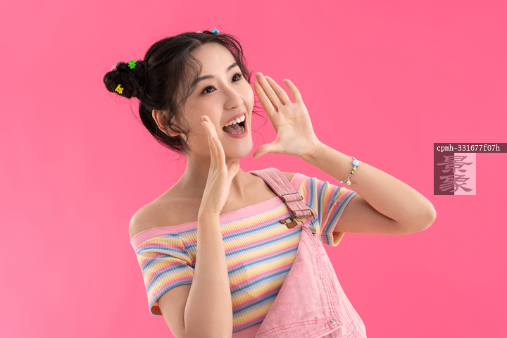 图片标题: 粉色背景下穿背带裤的快乐女孩