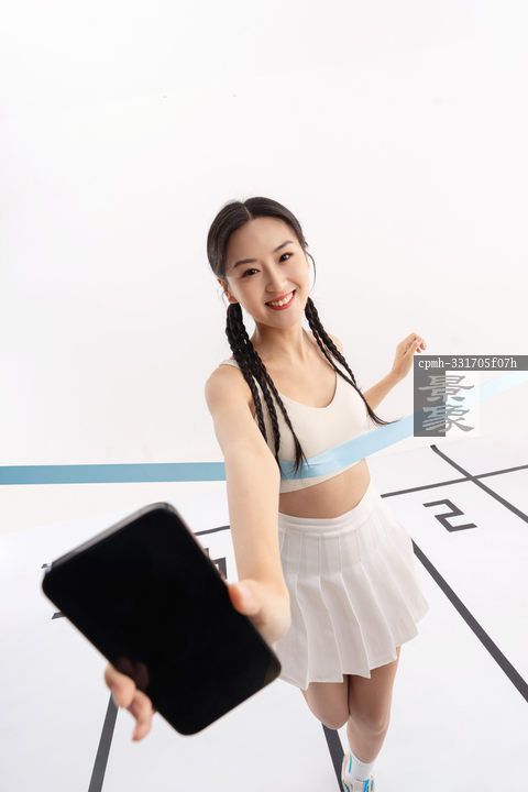 图片标题: 一位青年女人拿着手机奔跑冲刺