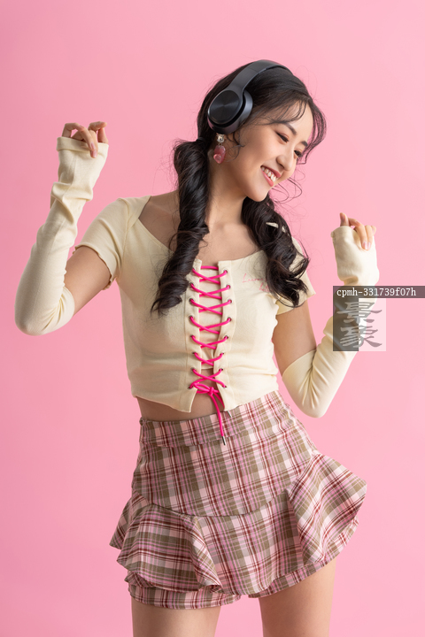 图片标题: 粉色背景下听音乐跳舞的快乐女孩
