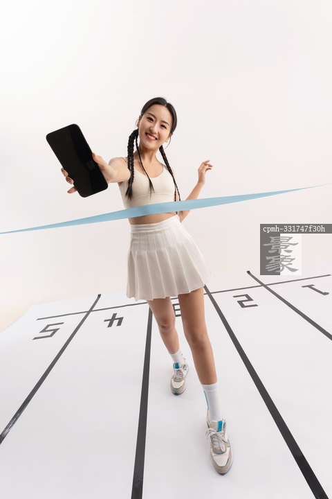 图片标题: 一位青年女人拿着手机奔跑冲刺