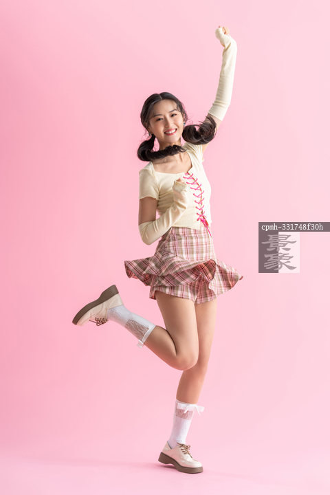 图片标题:     粉色背景下的一位年轻快乐女孩