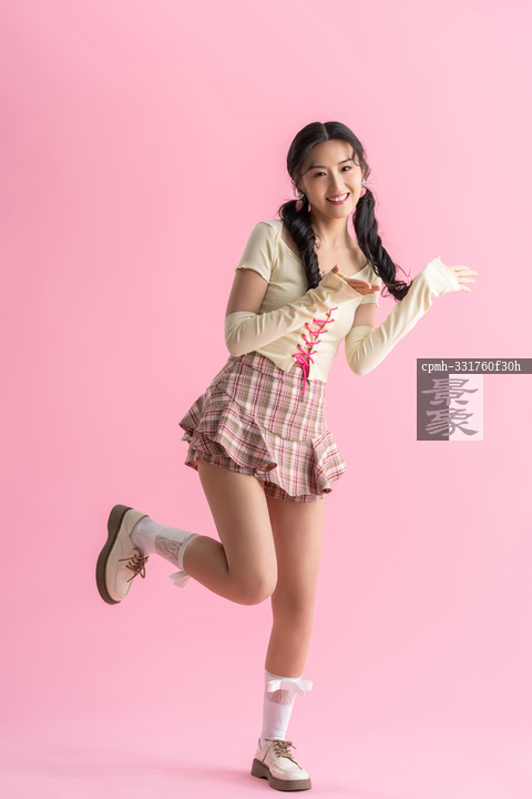 图片标题: 粉色背景下的一位年轻快乐女孩