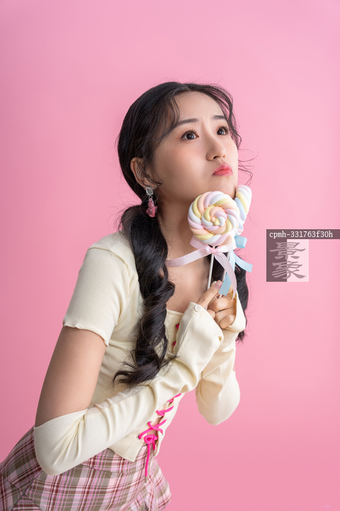 图片标题:     粉色背景下的青年女人拿着棒棒糖