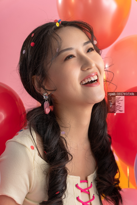 图片标题:     一位充满活力的年轻女孩拿着大量气球