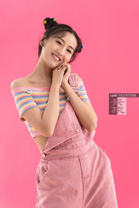 图片标题: 粉色背景下穿背带裤的快乐女孩