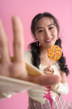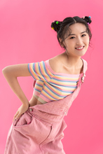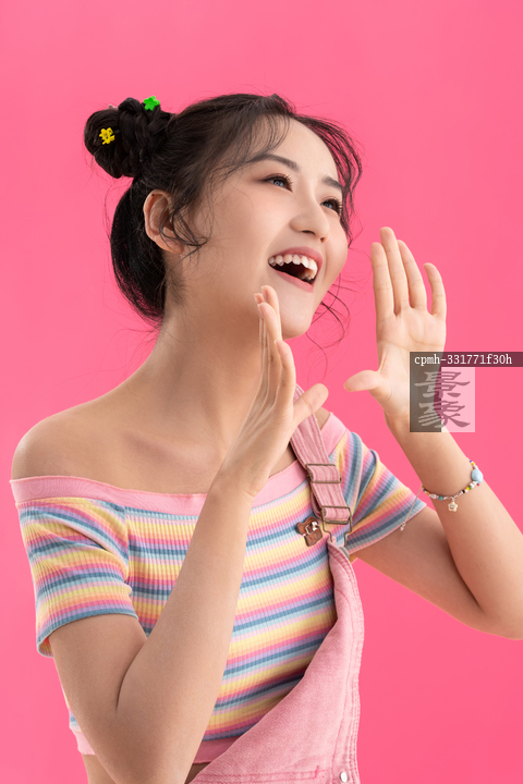 图片标题: 粉色背景下穿背带裤的快乐女孩