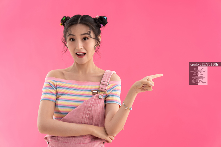图片标题: 粉色背景下穿背带裤的快乐女孩