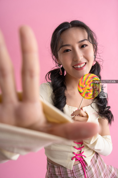 图片标题:     粉色背景下的青年女人拿着棒棒糖