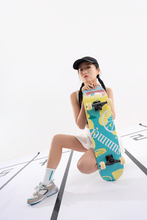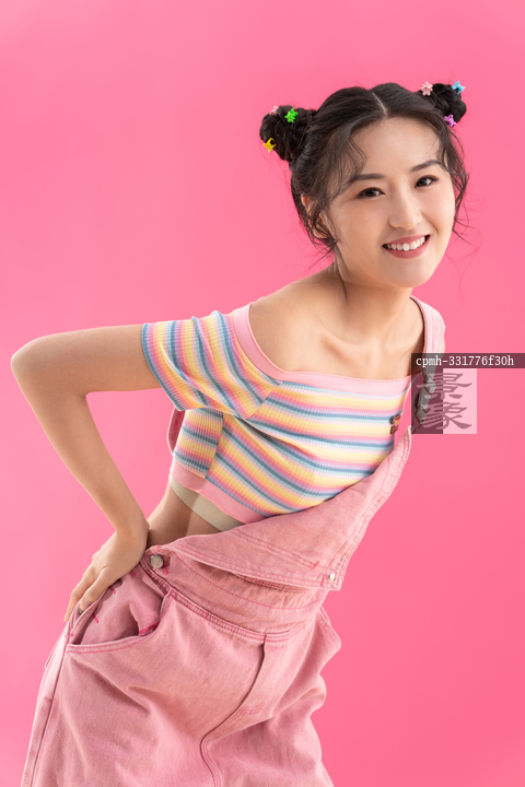 图片标题: 粉色背景下穿背带裤的快乐女孩