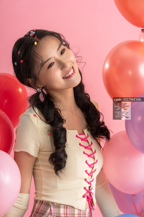 图片标题: 一位充满活力的年轻女孩拿着大量气球