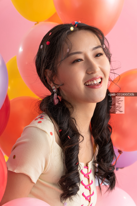 图片标题: 一位充满活力的年轻女孩拿着大量气球