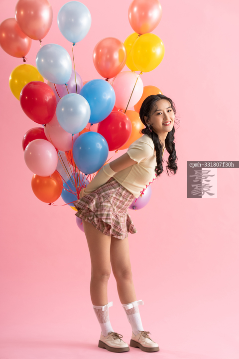 图片标题:     一位充满活力的年轻女孩拿着大量气球