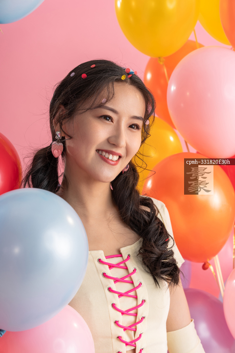 图片标题:     一位充满活力的年轻女孩拿着大量气球