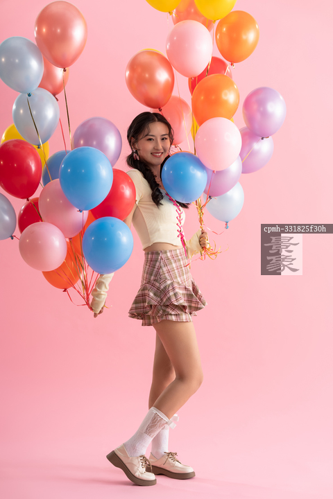 图片标题:     一位充满活力的年轻女孩拿着大量气球