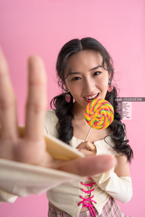 图片标题: 粉色背景下的青年女人拿着棒棒糖
