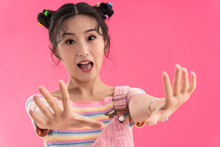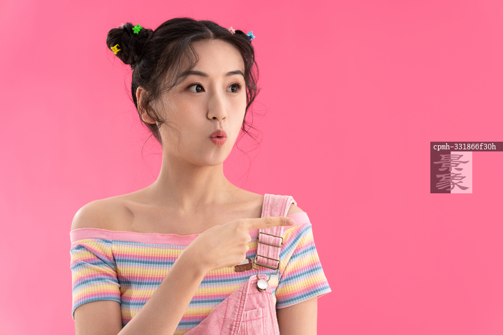 图片标题: 粉色背景下穿背带裤的青年女人