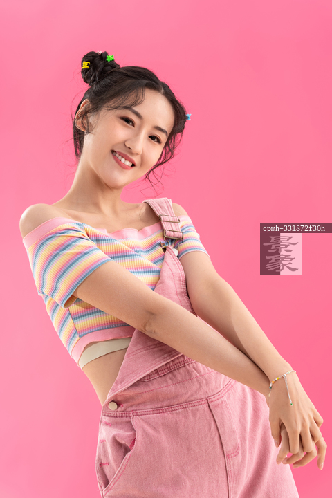 图片标题: 粉色背景下穿背带裤的快乐女孩