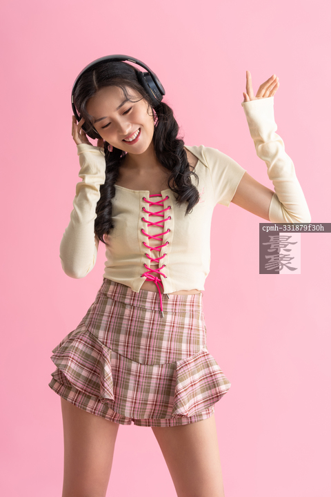 图片标题: 粉色背景下听音乐跳舞的快乐女孩