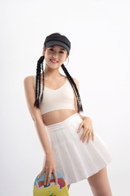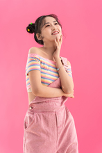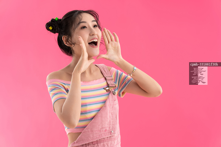 图片标题:     粉色背景下穿背带裤的快乐女孩