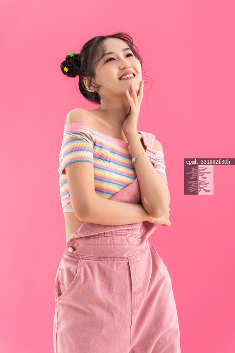 图片标题: 粉色背景下穿背带裤的快乐女孩