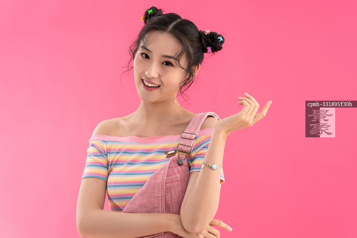 图片标题: 粉色背景下穿背带裤的快乐女孩