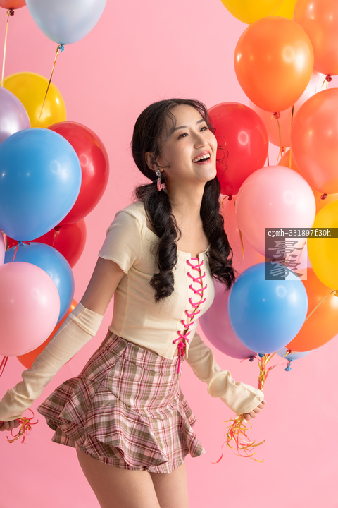 图片标题:     一位充满活力的年轻女孩拿着大量气球