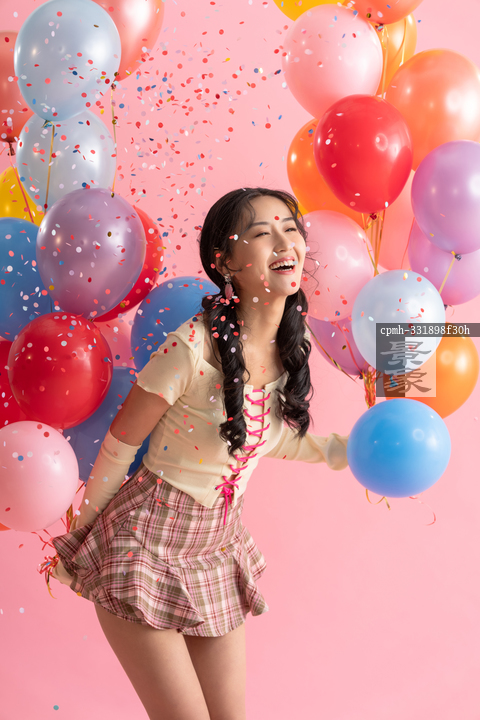 图片标题: 一位充满活力的年轻女孩拿着大量气球