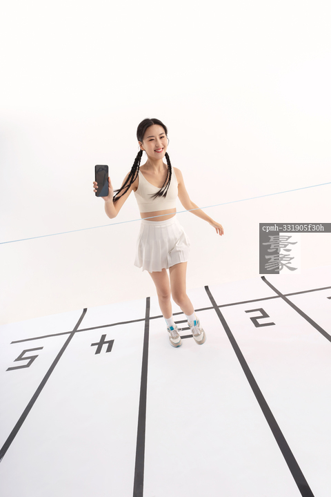 图片标题:     一位青年女人拿着手机奔跑冲刺
