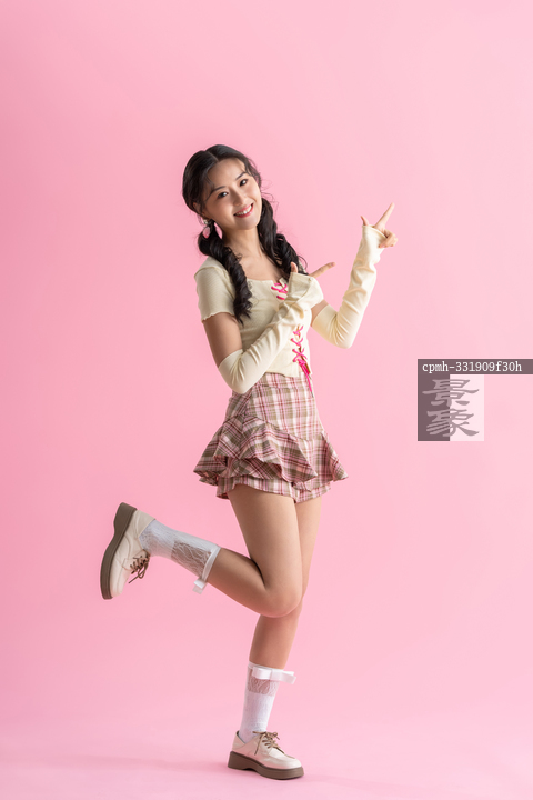 图片标题: 粉色背景下的一位年轻快乐女孩