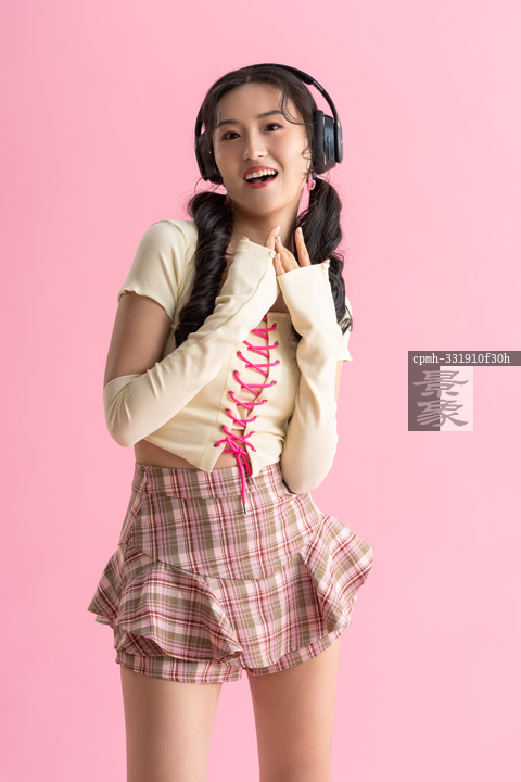 图片标题:     粉色背景下听音乐跳舞的快乐女孩