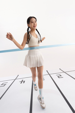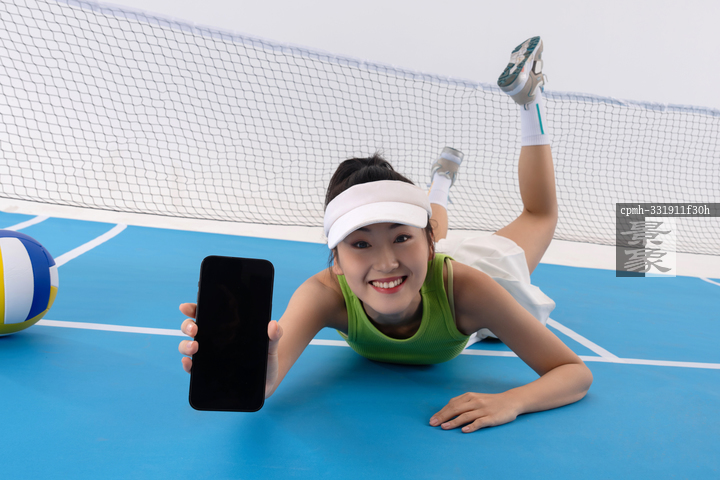 图片标题: 一位青年女运动员趴在球场上展示手机