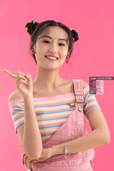 图片标题:     粉色背景下穿背带裤的快乐女孩