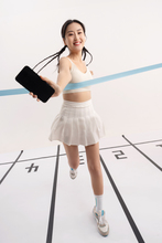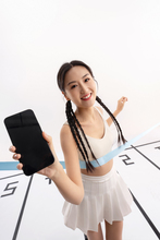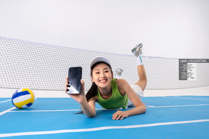 图片标题:     一位青年女运动员趴在球场上展示手机