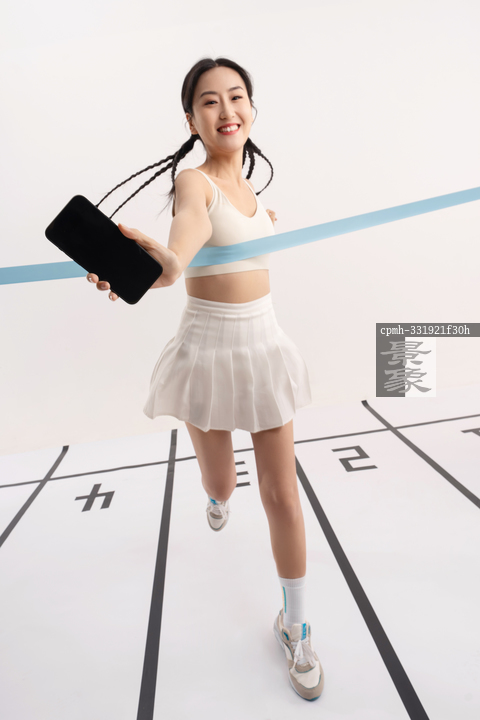 图片标题: 一位青年女人拿着手机奔跑冲刺