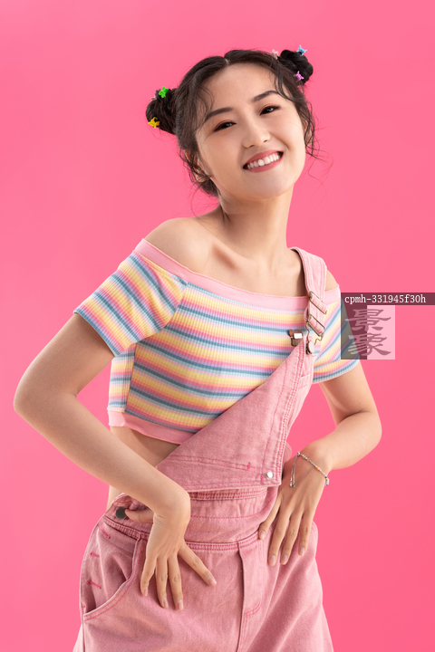 图片标题: 粉色背景下穿背带裤的快乐女孩