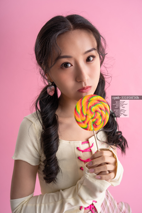 图片标题: 粉色背景下的青年女人拿着棒棒糖