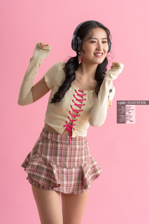 图片标题:     粉色背景下听音乐跳舞的快乐女孩