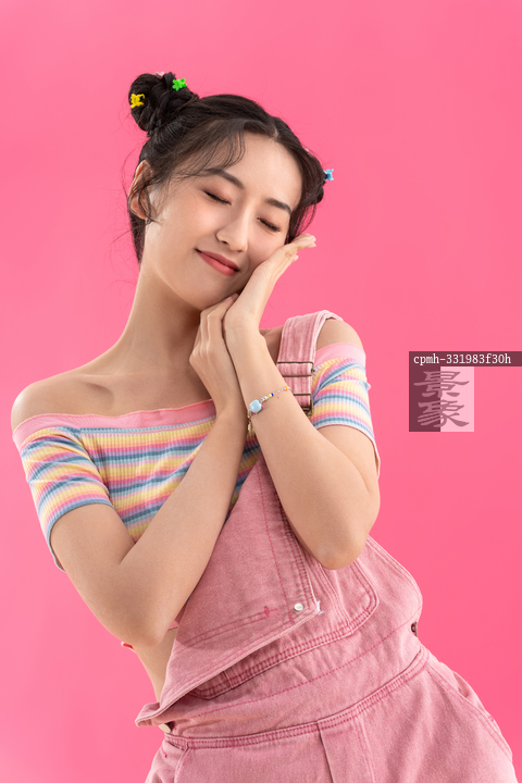 图片标题:     粉色背景下穿背带裤的快乐女孩