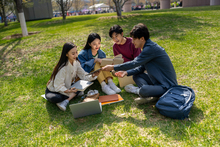 图片标题: 校园里坐在台阶上学习的大学生