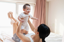 图片标题: 沙发上年轻妈妈抱着宝宝举高高