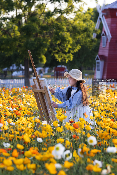 图片标题: 漂亮的小女孩站在花海里绘画
