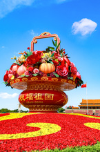 图片标题: 北京:国庆巨型花篮亮相天安门广场