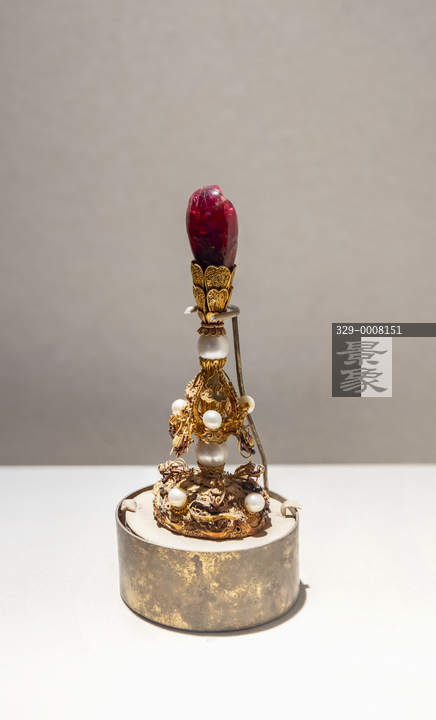 图片标题: 故宫珍宝馆-金累丝龙纹嵌珍珠宝石帽顶-清代
